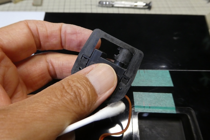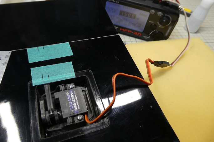 ![]() ロッドは71.5ミリの物を使用しました。 ![]() サーボホールの接着面をサンディングして足付けをしておきます。 ![]() サーボを取り付けようと思って、手に持った所、サーボホーンがサーボベッド底面からはみ出ているのを見付けてしまい ました。 ![]() サーボホーンの下側を約1ミリ削って、はみ出さないようにします。 ![]() ついでに、コードの首回りが取り回し時にキツかったので、グロメットを外しておきました。 ![]() サーボホールの接着面を硬化促進剤で拭いておきます。 ![]() ![]() サーボベッドの接着面をサンディングして足付けをし、硬化促進剤で拭いておきます。 ![]() 仮組みをして見た所、ロッドがサーボホールの入り口に干渉したので、ロッドのリブ部分を削り落としました。 ![]() エルロンのにユュートラルをスチールのスケールを使って合わせて、サーボは1500μsのニュートラルに合わせ、 サーボベッドの対角2点のみ、中粘度瞬間接着剤の点付けで仮固定します。 ![]() 動作確認をして、干渉や動きの渋いところが無いか確認が出来たら、サーボベッドの全周に中粘度瞬間接着剤を流して サーボベッドを接着します。 ![]() サーボコードには6ミリのシュリンクチューブで持ち手を付けました。 |