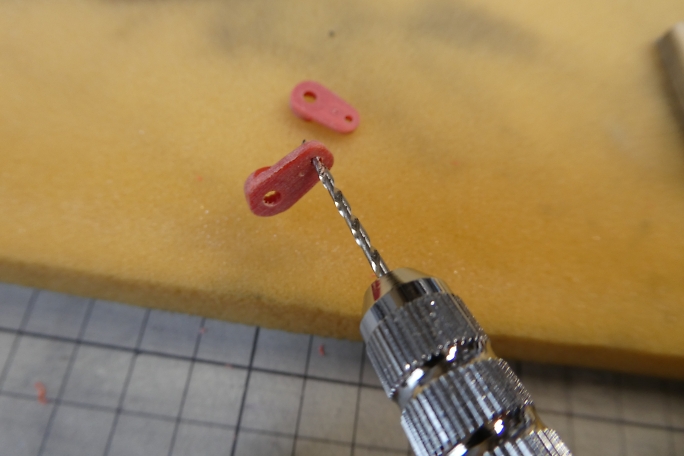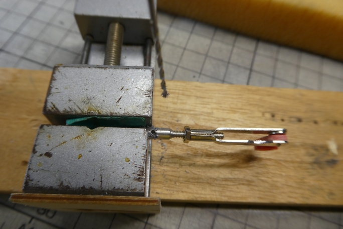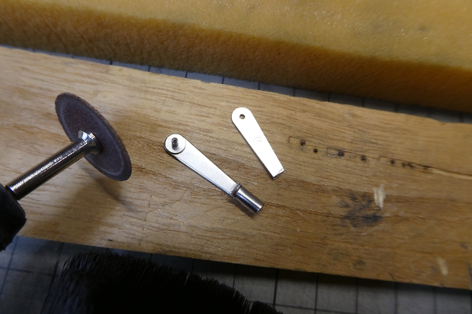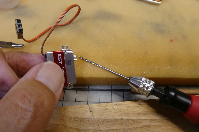 ![]() Explorer Q等で使ったプッシュナットを今回も使用します。 金属クレビスの片面をリューターの切削砥石でカット します。 ![]() プッシュナットでクレビスとサーボホーンを組み合わせておきます。 ![]() サーボの取り付けには1.7ミリのタッピングねじをしようするので、サーボの取り付け穴を1.7ミリドリルで拡大 します。 ![]() ロッドアジャスターには1ミリドリルで空気抜き穴を加工しておきます。 |