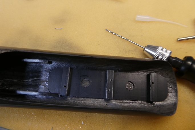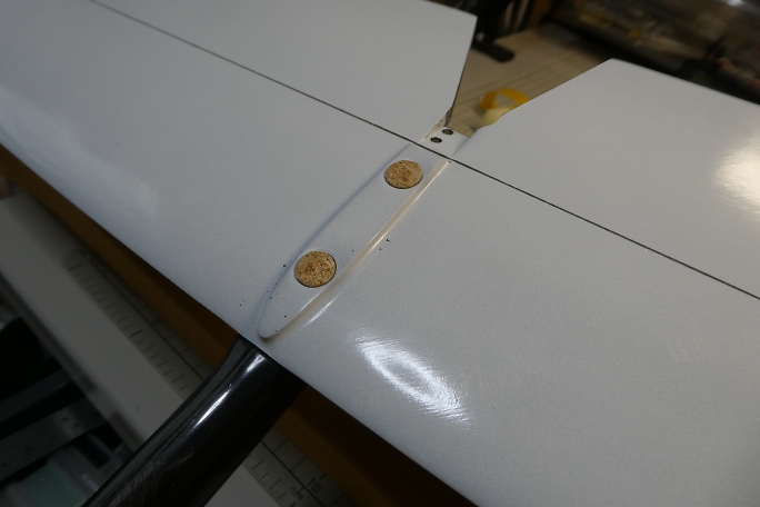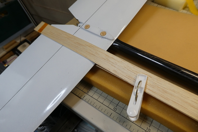 ![]() 胴体のサーボベッド取り付け予定地には歴代パーテーションの盛り上がりがあり、そのままではサーボベッドが浮いて しまいます。 ちなみに、今までの機体と違い、この面は下面になります。 ExplorerQ等とはサーボ面が180°違います。 ![]() 盛り上がりを綺麗に削り取って、平らな面にしておきます。 ![]() サーボベッドの接着面は硬化促進剤で拭いておきます。 ![]() サーボベッドを前詰めに置き、低粘度瞬間接着剤で接着します。 穴からも瞬間接着剤を流して、接着を確実に します。 ![]() 1.4ミリドリルでサーボ取り付け穴の下穴を開けます。 |