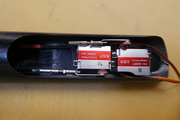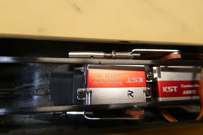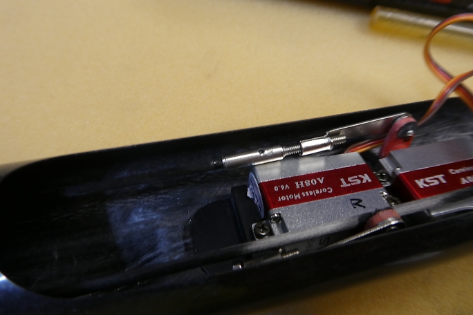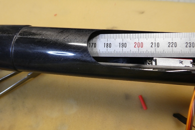 ![]() サーボホーン、クレビスを取り付けたサーボを1.7ミリタッピングねじで取り付けます。 ![]() 今までの機体は、リンケージの振れ止めにサポートを設置していましたが、この機体は開口部から170ミリの所にサポート付きの 胴枠があるので、サポートの取り付けは割愛します。 |