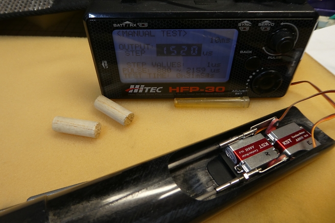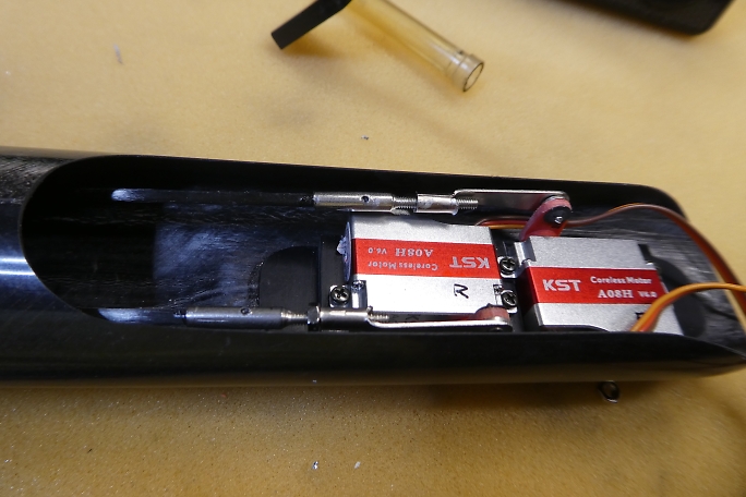![]() ラダーのリンケージもエレベーター同様にサーボとラダー舵面のニュートラルを合わせて、ロッドをカット、接着部を サンディングしておきます。 ![]() ![]() 簡易ニュートラル出しツールでラダーのニュートラルを合わせ、サーボを1520μsのニュートラルに合わせて、ロッド アジャスターとリンケージロッドを低粘度瞬間接着剤で接着します。 ![]() ラダー、エレベーターリンケージ完了です。 |