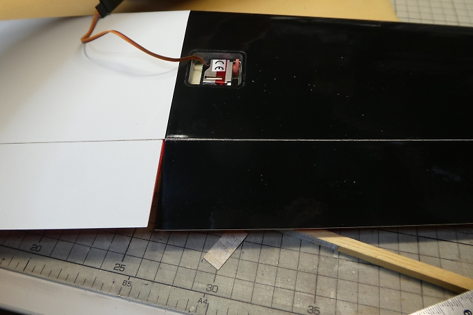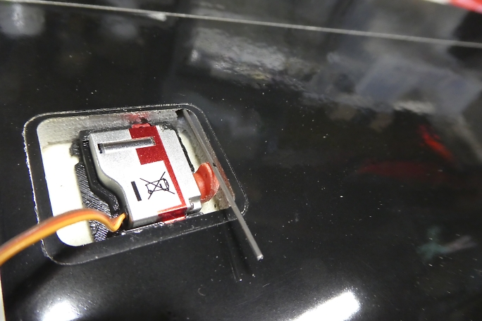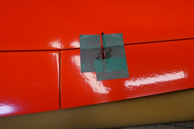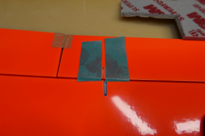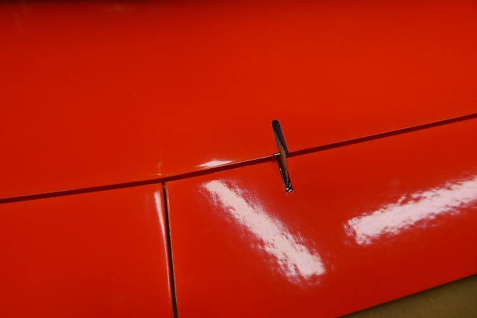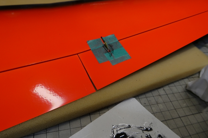 キット付属のエルロンホーンの接着部をサンディングして足付けをしておきます。 ![]() メーカー加工のエルロンホーンスロットの両端を0.5ミリ程離して、マスキングテープで養生をします。 ![]() カーボンパウダー入り5分エポキシをスロットに充填します。 ![]() ロッドを取り付けた状態のエルロンホーンをはみ出てくる5分エポキシをを取り除きながら、一番下まで沈めます。 ロッドは後から取り付けるのは至難の業です。 この時点で取り付けておくのがベストです。 ![]() マスキングテープは直ぐに剥がしておきます。 硬化するまでに、左右に倒れていないか、角度を良く見ておきます。 |