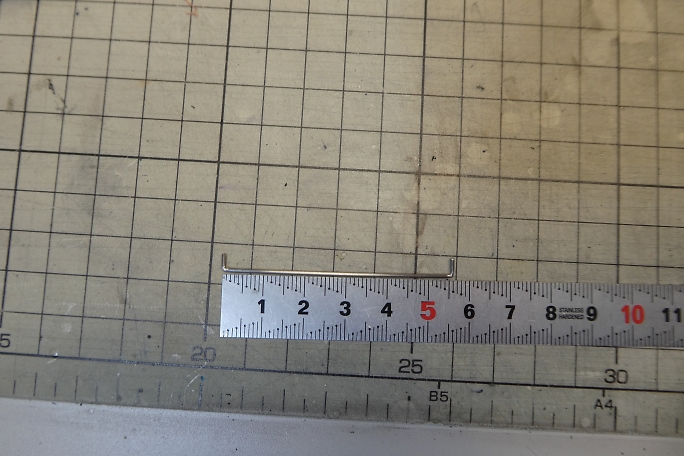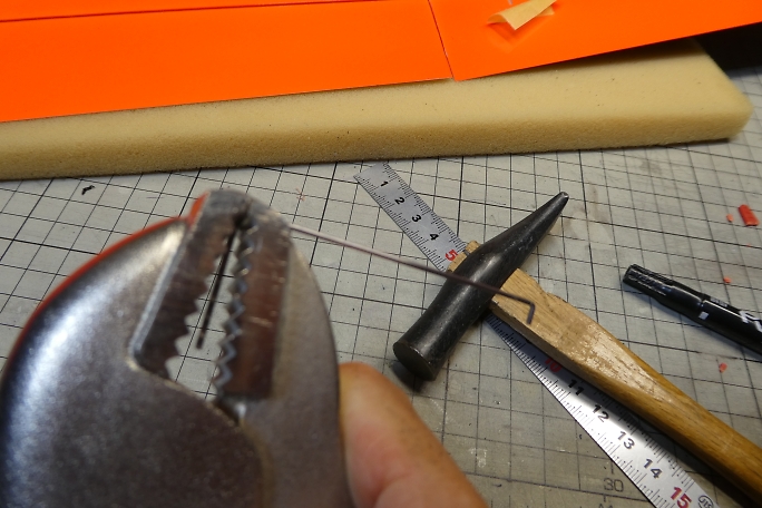 ロッドを取り付けたエルロンホーンを仮止めして、サーボを1500μsのニュートラル状態でサーボホーンの穴位置を ロッドにマーキングします。 曲げる位置になります。 ![]() マーキングしたサインペンの太さの短くなる側をバイスプライヤーで挟んで、ハンマーで叩いて直角に曲げます。 角がキッチリと出るので、リンケージ用に曲げる方法としてはおすすめです。 ![]() 出来上がったエルロンリンケージ。 切った端面は面取りをしておきます。 |