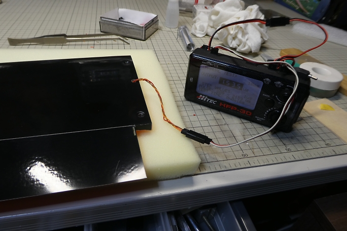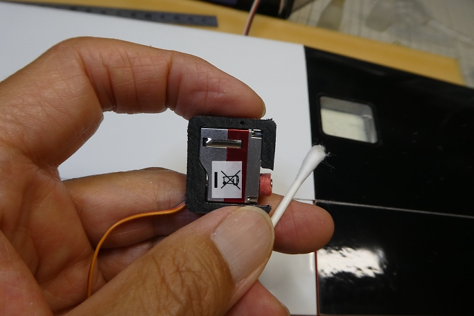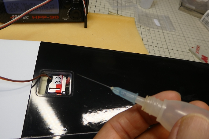 ![]() サーボホールとサーボベッドの接着面を硬化促進剤で拭いておきます。 ![]() サーボテスターでサーボを1500μsのニュートラルに合わせて、殆ど動きませんが、サーボの位置でエルロンの ニュートラルを探り、サーボベッドの四隅に中粘度瞬間接着剤の点付けで接着します。 ![]() 硬化促進剤で硬化させます。 この時の硬化促進剤はボブスミスを使用します。 ![]() 動作確認をします。 キット付属のエルロンホーンは穴が少し大きめでした。 ガタが気になりますが、仕方無いです。 |