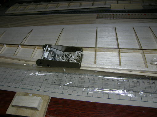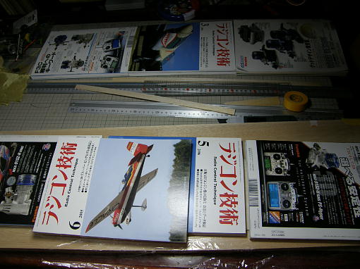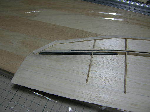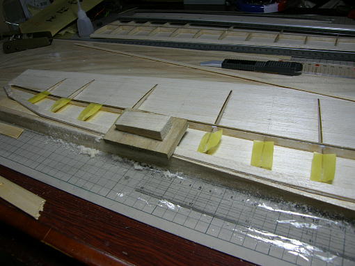 ![]() プランクには2種類の瞬間接着剤を使います。 先ず、低粘度の瞬間接着剤をリブの断面に染みこませて目止めにします。 完全硬化をした後に高粘度接着剤を盛ると、直ぐには硬化せずにいてくれるから です。 ![]() リブ、スパー、前縁材に接着剤を盛りつけます。 後縁部分には特にしっかり盛って 置きます。 この部分は後で切り離してエルロンになりますから丈夫にしておきたい ですね。 ![]() 上面プランクを馴染ませたら、瞬間接着剤と言えども完全に硬化するまで重石を乗 せておきます。 下面が平らな翼型ですから、この様なときには便利です。 |
