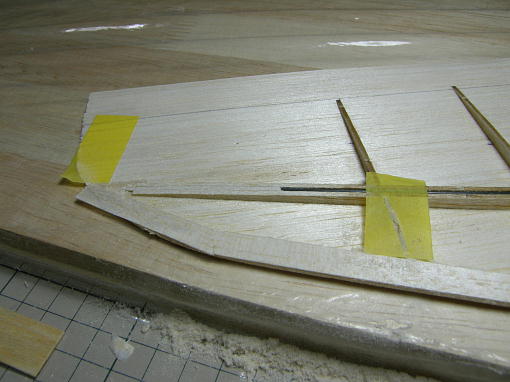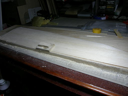![]() 前縁をバルサかんなで荒削りをします。 リブを引っかけて割らないように注意しましょう。 ![]() 荒削りの後にサンディングブロックでサンディングして、リブのカーブにきっちりと 合わせます。 リブには紙テープを貼ってリブが削れないように保護します。 ![]() 翼端のブロックもスパーと翼端材をを含めて上面のプランク材が馴染む形状になる まで削り込みます。 ![]() 左側はカーボンパイプの補強が入っていますが頑張って削ります。 翼端は出来るだけ薄く仕上げたいんです。 |