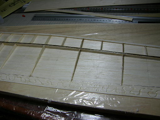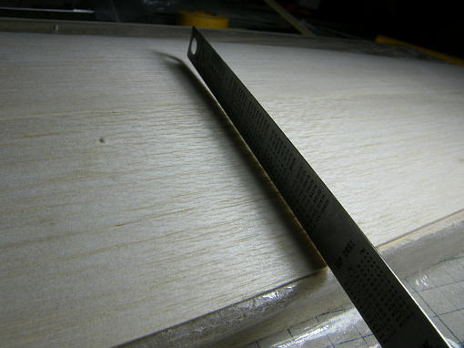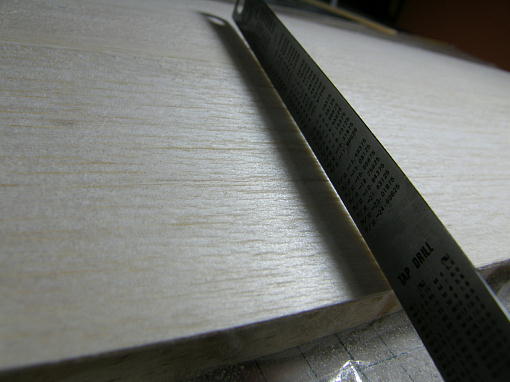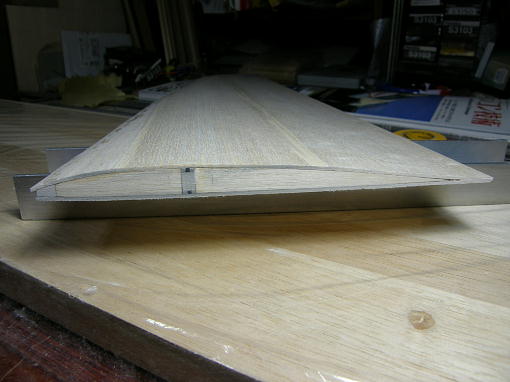 ![]() 中央リブを接着するために端面を削って仕上げます。 ![]() 端面を削り出した状態です。 翼型、前縁材、スパーなどが良く判るカットです。 ![]() 10ミリバルサの中央リブを接着します。 中央リブとは言え、ただのバルサ板ですので、プランク材の削りだしと一緒に削り出 します。 ![]() 後縁部分はこの様に段になってしまっています。 まるでAG45見たいですがこの 翼型はこの部分は綺麗なアールになっていないといけません。 ![]() 徹底的に、ただ、ただ削り出します。 後縁から25ミリ程度はムクですが、そこから先は飛び飛びにしかリブが入っていま せん。 力を入れれば波打ってしまいますから滑らせる程度の力で削ります。 ![]() |