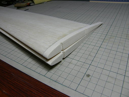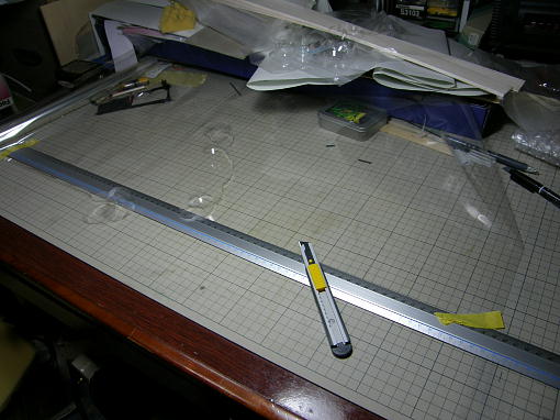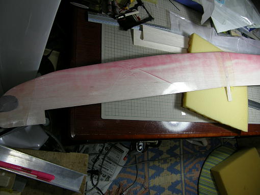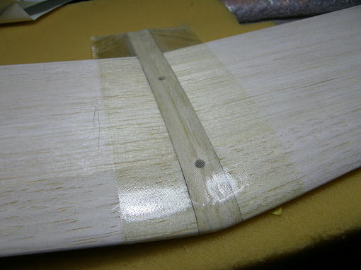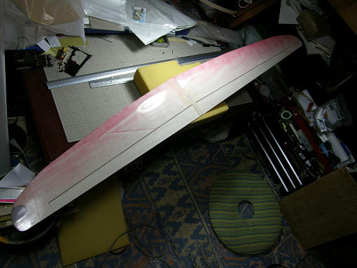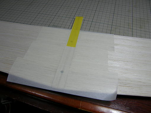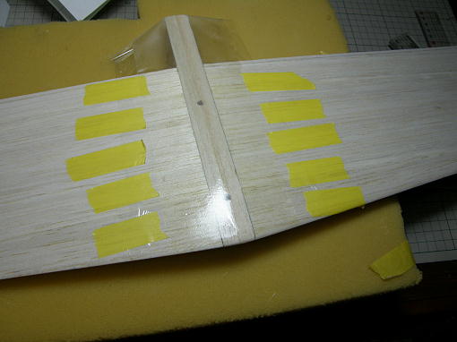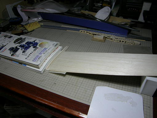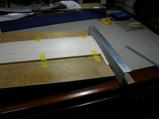 ![]() 端面の角度出しを行います。 定盤を傾けて、必要な角度を作ります。 500ミリ行って100ミリ上がるのが指定の角度です ので、半分だから500ミリの所で50ミリ持ち上げてあります。 前後の端が削れないなうに注意します。 ![]() ネジ受けのアルミパイプが入る溝はこの時点で作っておきます。 接着後でも出来なくは無い のですが、バルサの柔らかさに比べて接着剤の部分が堅くて削りにくいんです。 ![]() 下面を紙テープで貼り合わせます。 たまたま、幅広のテープがあったので全面を貼っていますが、いつもは15ミリ幅の物を数本 で済ませています。 ![]() 5分エポキシ接着剤を両翼の端面に擦り込むように塗って、片側に重石を乗せて規定量だけ 反対側を持ち上げます。 |