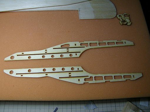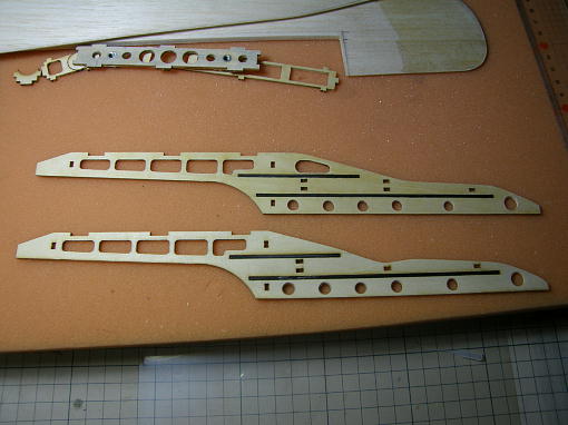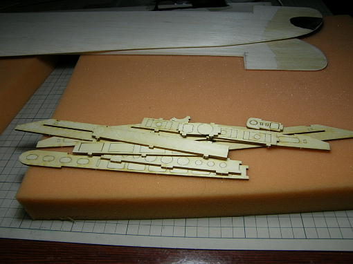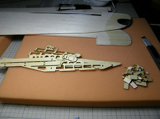 ![]() 2ミリシナベニヤをレーザーカットして作られている胴体の構成パーツ一式です。 枠部分から取り外しました。 サーボベッドのパーツはサーボに合わせて2種類の物が入っていますが、どのサーボを使う かは、この時点で決めておきましょう。 組み上がってしまってからでは変更は出来ません。 ![]() 更に肉抜き部分を抜きました。 右の方に写っている山が抜いた部分です。 もったいないので一まとめにして取っておきました。 「何か」に使えるかもしれません。 肉抜きは取り外しましたが、中央に移っている胴枠パーツのパイプが刺さる部分は外さずに 置きました。 これを取ってしまうと、胴枠が上下に泣き別れてしまいます。 |