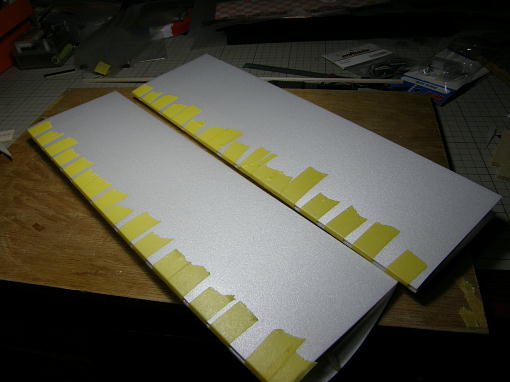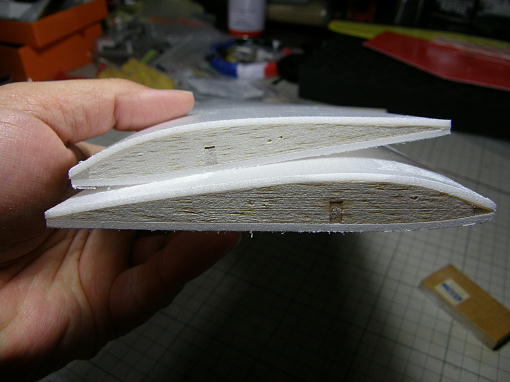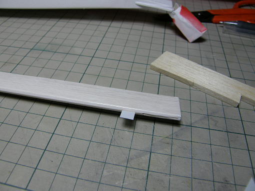 ![]() 断面を削って平坦にします。 この作業をキッチリとすると主翼の接合強度が上がります。 この写真はまだ削りが甘いです。 下の翼のスパーとリブがツライチになっていません。 ![]() 下面を紙テープでずれないように接合します。 ![]() 5分エポキシを接合面両面に擦り込むように塗り込み、指定の上反角になるようにカイ物をして硬化を待ち ます。 片側の重石は雑誌程度で充分です。 ![]() カイ物はスチレンペーパーの余りに指定の高さに切り欠きを付けた物です。 |