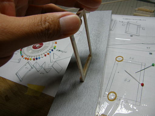 ![]() 側板に補強材を貼り付けます。 前の補強材から貼っていくと位置決めが出来ます。 |