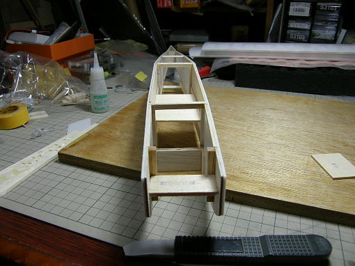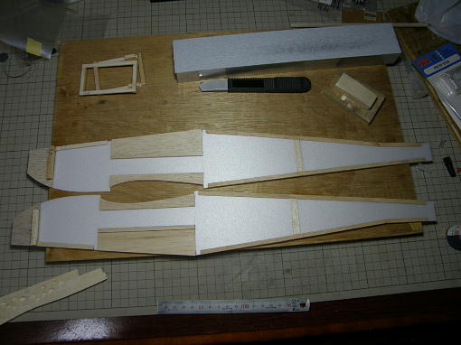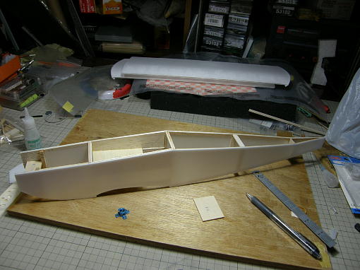 ![]() 胴枠を接着して立体に組み上げます。 ![]() ネジレ、曲がりに細心の注意を払います。 この時点ではモーターマウントは接着しません。 代わりにキット添付の機首の成型補助材を接着して あります。 このパーツは後で取り外します。 |