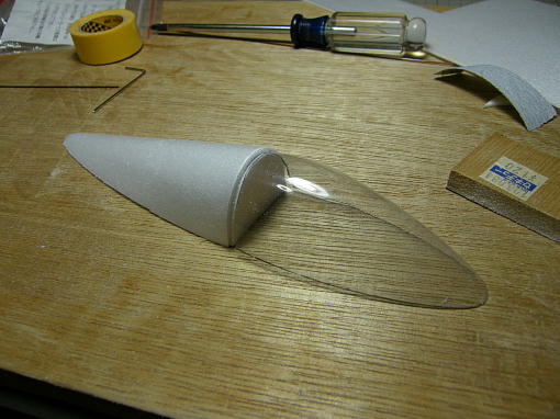 ![]() 本来はオープンコクピットなのですが、昔ながらの塩ビ製キャノピーが手に入ったのでクローズドコクピット としてみました。 深い意味はありません。 キャノピーは本来後ろになる部分です。 前1/3をカットして、前後をひっくり返しています。 |