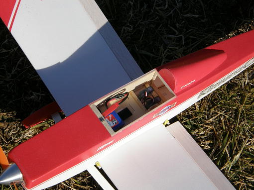 ![]() バッテリーは本来ならバッテリースペースに収まるのですが、重心位置調整の為に半分胴体に潜った 状態になってしまいました。 |