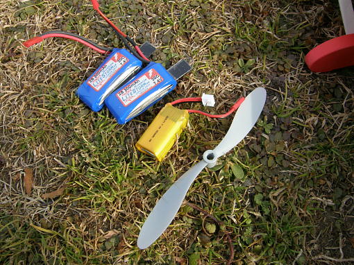 ![]() バッテリーは300mAhの物(青いパッケージ)と350mAhの物(黄色いパッケージ)を用意しました。 キット付属のプロペラは6*3と写真に写っている6*5の物です。 冬場でバッテリーが本調子ではないかも知れませんが、6*3で約8900rpm、2.8A。 6*5で約7800rpm、3.4Aでした。 飛ばした感じは6*3は遊覧飛行、6*5は軽スタントが出来るレベルです。 モーターのKV値が一 段上の物なら更に元気良く飛んでくれるでしょう。 6*5で5分ほど周回飛行させて100mAh程度の消費でした。 ![]() 重心位置の関係でバッテリーは前よりに搭載しています。 |