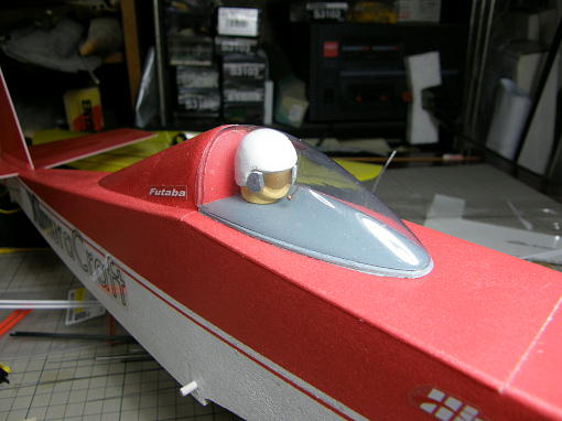 ![]() キャノピー内が寂しいので、パイロットを作ってあげました。 バルサから一体で削りだして塗装、 スモークに塗ったOHPシートで作ったシールドにマイクを付けてあげました。 首の裏に両面テープを貼って固定しています。 |