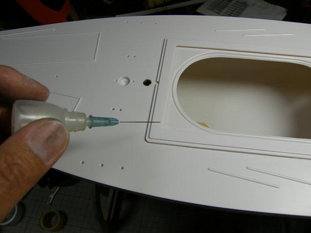 ハッチのガイドレールを接着します。 キットには刷毛付きのABS用接着剤が同封されているのですが、スポイト に接着剤を詰め替えて、接着剤を流すようにして接着します。 接着剤はアセトン系の溶剤で、あっという間に蒸発します。 |