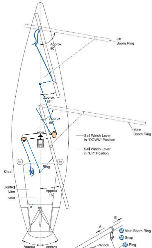 ![]() セールコントロールラインの取り回しを変更します。 キット通りですと、ラダーの横当たりからラインを取り出し、 デッキ上を進んで、一本のラインでメイン、ジブブームをコントロールします。 セールサーボは片腕式で、ホーンはキットに付属します。 ![]() 変更後はセールサーボを両腕式として、デッキからの取り出し口をメインセール用、ジブセール用と分けます。 |