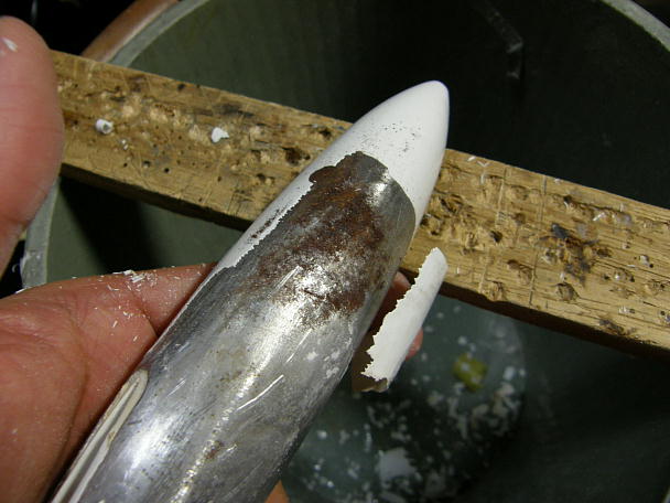 ![]() これが安かった理由? バラストの塗装が浮いて剥がれていました。 ここだけではなく、所々剥げそうな所が見えました。 ![]() 塗装を剥いでみると、鋳鉄製のバラストが錆びてしまっています。 ![]() 塗装を全部剥いで、徹底的に磨き上げました。 ![]() 鋳鉄製のバラストに塗装をするにあたって、食いつきが良くなるようにプライマーを使います。 今回はミッチャ クロンと言う万能プライマーを使用しました。 ![]() アセトンで脱脂したあと、ミッチャクロンで下地を作りました。 バラストが900gもあるので、固定も大変でした。 |