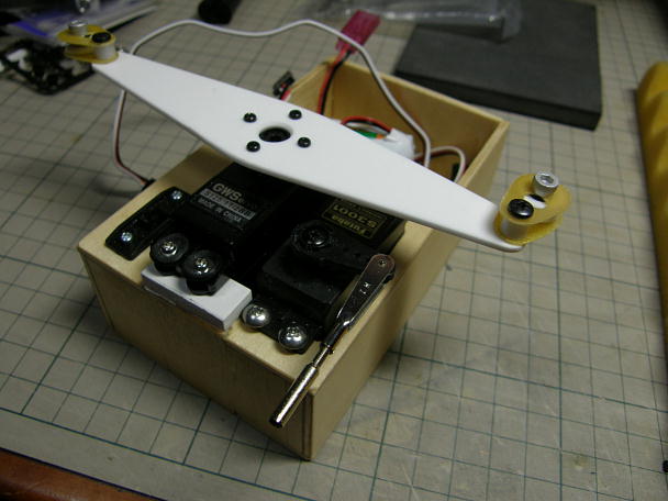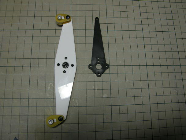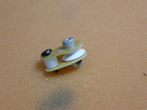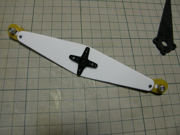 タミヤのプーリーセットとジュラコンスペーサー、FRP板を使ってプーリーブロックを自作しました。 ![]() セールサーボのアームは2ミリのアクリル板から切り出しました。 スタンダードのサーボホーンにM2.6のタッピング ネジで固定します。 ![]() 十字のサーボホーンを介してサーボに取り付けられます。 プーリーブロックもセットされています。 ![]() アーム長は当初キット付属のアームと同じ長さにしましたが、セールサーボのストロークが活かし切れないので後に サイズを詰めています。 ![]() メカ一式を乗せてみました。 ![]() セールサーボとラダーサーボのホーンはこの様な隙間となります。 |
