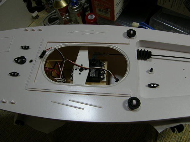 ![]() メカボックスはハルに5分エポキシで接着します。 メカボックスを取り付ける位置をマーキングしたら、接着する部分 をきっちりサンディング+脱脂しておきます。 セールサーボにホーンを付け状態でメカボックスを接着します。 ホーンとデッキの間隔でメカボックスの水平を決めます。 キットの指示ではもう少し後ろにメカボックスを接着することになっていますが、きむらクラフトではメカボックスを前詰めに 置いて、センターキールの補強に接着、補強を分担させています。 |