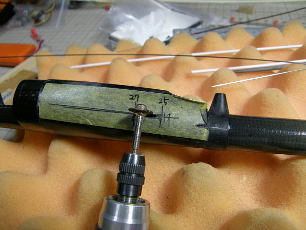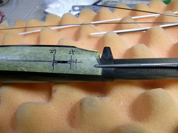 ![]() ポッドにエルロンコントロールロッドの出る穴を加工します。 メーカーの指示ではポッドの隙間からロッドを出す ようになっていますが、そこからロッドを取り出すと、リンケージを湾曲した形で設置することになり、これでは理想 的なストレートリンケージとは言えません。 エルロンホーンとエルロンサーボのホーン、ロッドの取り出し穴が極力一直線になる位置を探します。 ![]() ロッドは0.8ミリSUS線で、アウターはキット付属の外径2ミリのプラパイプです。 主翼のエルロンホーンの間隔は26ミリですのでプラパイプの外径の分の幅、26ミリ+1ミリと−1ミリでマーキングを します。 書いてある数字はポッドの幅を計った物で、25ミリから27ミリの幅で切り欠くと丁度真っ直ぐにパイプが走る 計算になります。 ![]() 切り欠いた後に、パイプの形状に合わせて端を棒ヤスリなどで削ります。 ![]() 続いてエレベーターとラダーリンケージの通る穴を開けます。 こちらはパイプの中心を通る様に穴を開けます。 エレベーターリンケージは自然な流れでパイプ上方に回り、ラダーリンケージはそのまま後方に流れます。 ロッドにカーボンロッドを使用しますので、急カーブは動きが途端に渋くなりますので不許可です。 ![]() 後部の主翼マウントは樹脂で出来ていて肉厚です。 そこにリンケージを乗せるとかなり隙間が空いてしまいます ので、リンケージを埋め込む溝を掘ってしまいます。 |