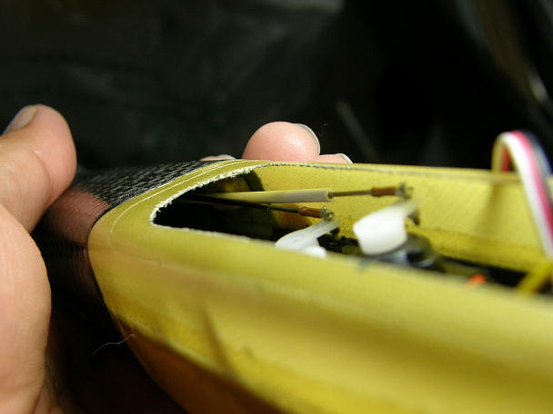 ![]() エルロンのコントロールロッドはロッドエンドと接着する部分をサンドペーパーで荒らして足付けとし、接着を確実に します。 ![]() サーボテスターでニュートラルを出して、コントロールロッドとアジャスターを接着します。 ニッパーの刃先で軽く カシメてから瞬間接着剤を流します。 ![]() バルサで作った馬を接着してコントロールロッドの振れ止めとします。 |