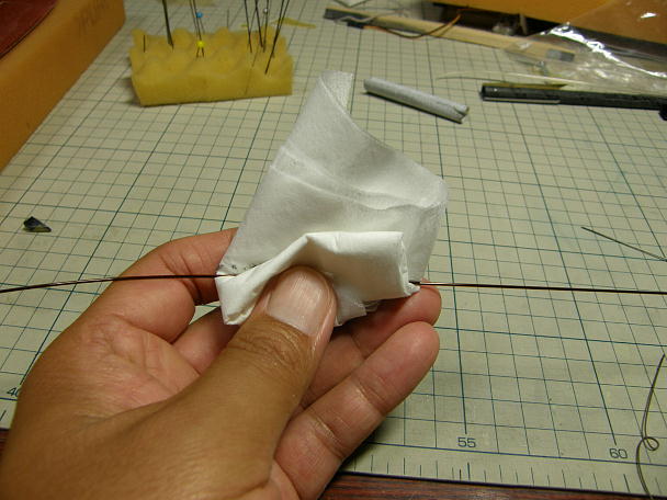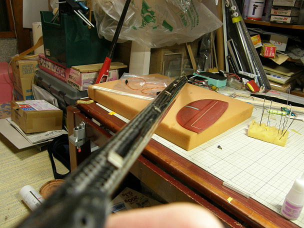 ![]() リンケージはカーボンロッドのプッシュプルとします。 世間ではトーションバーが流行ですが、動作の確実なカーボン ロッド方式が好きです。 ポリイミドチューブを胴体内部に瞬間接着剤で接着します。 その前段として、接着を確実にするためポリイミドチュー ブの表面を硬化促進剤を染みこませたティッシュで拭いておきます。 ![]() ![]() ポリイミドチューブに0.8ミリの綱線を通し、胴体表面からネオジウム磁石で引っ張って固定します。 真っ直ぐに なるように磁石の位置を微調整します。 テールから瞬間接着剤を流して接着します。 |