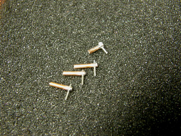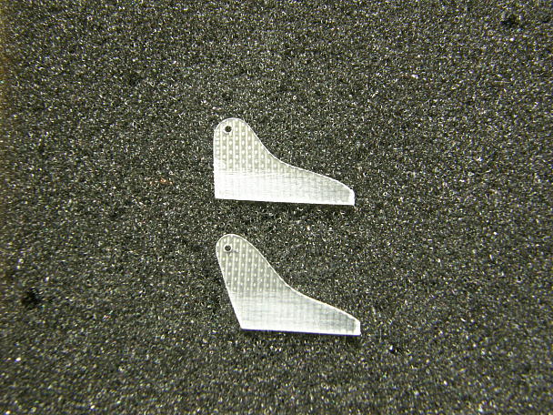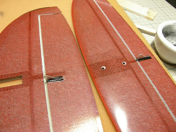 ![]() ロッドエンドを製作します。 一番上の小さい物はエレベーターの動翼側に使います。 ![]() 0.5ミリFRP板から切り出したホーンです。上がエレベーターホーンでレバー長8ミリ、下がラダーーホーンでレバー長 は10ミリです。 ![]() 動翼に切れ込みを入れ、周辺を3ミリ程サンディングしておきます。 ![]() カーボンパウダーを混ぜた5分エポキシで接着と同時にフィレットを整形します。 ![]() この様になります。 |