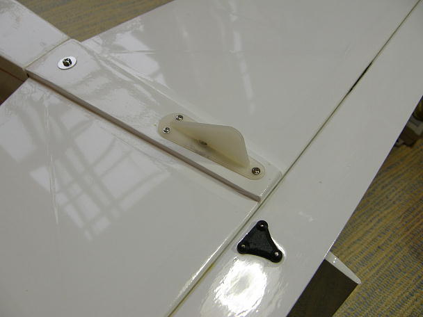 ![]() メインギヤの取り付けです。 ギヤ周りのフイルムを良く密着させてからフイルムに切り込みを入れ、メインギヤ を取り付け小物を使って固定します。 ![]() 3車輪式なのでテールは何も無いはずですが、胴体最下部に取り付けられた水平尾翼かしりもち時や主翼を 取り外したときに地面に触れますので、樹脂製のスキッドを取り付けます。 スキッドに水平尾翼取り付け用のネジ頭を回避する加工を施しました。 スキッド、取り付け完了です。 |