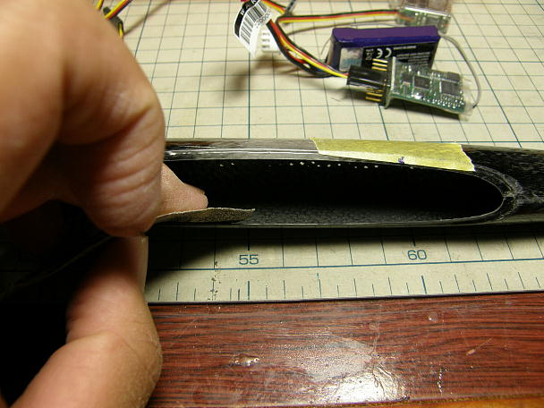 ![]() 接着を確実にする為に胴体内部をサンドペーパーで良く荒らしておきます。 ![]() 位置決めを良く確認して、瞬間接着剤を流して接着します。 ![]() 瞬間接着剤が硬化後、マスキングをしてからカーボンパウダー入り5分エポキシを盛って補強とします。 |