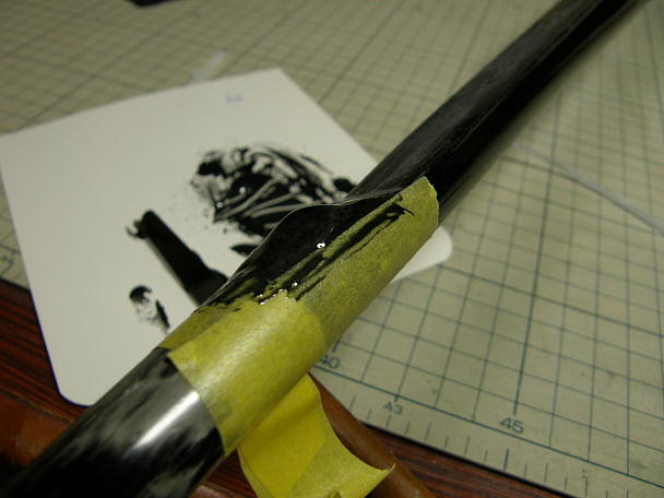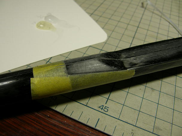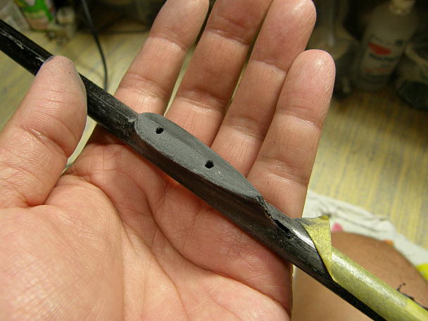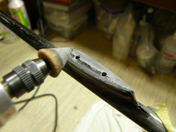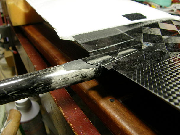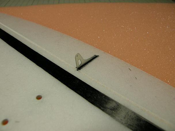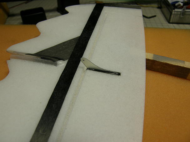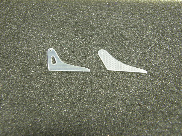 ![]() 0.5ミリFRP板から切り出したエレベーターホーン(左)とラダーホーン(右)です。 ![]() エレベーターホーンを取り付けます。 0.5ミリ幅に取り付け部の下面スキンのみ取り除き、ロハセルのコア を掻き出します。 上面スキンには傷を付けないように注意します。 ![]() カーボンパウダー入り5分エポキシで接着と同時にフィレットを整形します。 上面スキンにしっかり接着剤が回った事を確認します。 黒い物が透けて見えていたらOKです。 ![]() ラダーホーンも同様に接着します。 カーボンパウダーを混ぜるのは、黄ばみを防ぐためでもあります。 |