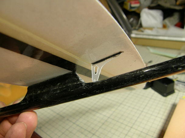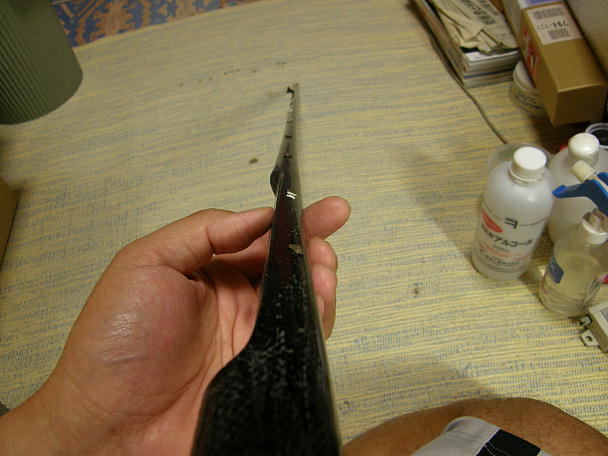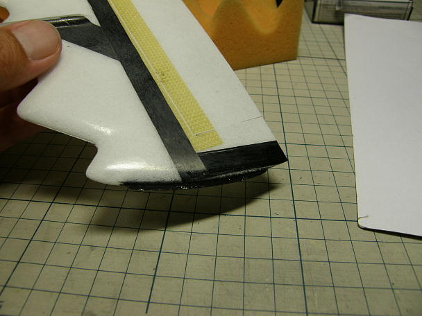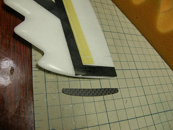 ![]() いつもの様に垂直尾翼下部にスキッドを付けます。 垂直尾翼下部のパーテーションラインにピラニアソーで 切り込みを入れます。 コアに達すると一気に切れますので力加減を忘れずに。 ![]() カーボンシートを切り出します。 接着を確実にするためにカーボンシートの両面を良くサンディングしておきます。 ![]() カーボンパウダー入り5分エポキシで接着します。 ![]() ラダーホーンとラダーリンケージ取り出しようの切り欠きです。 |