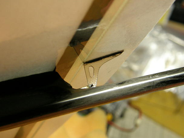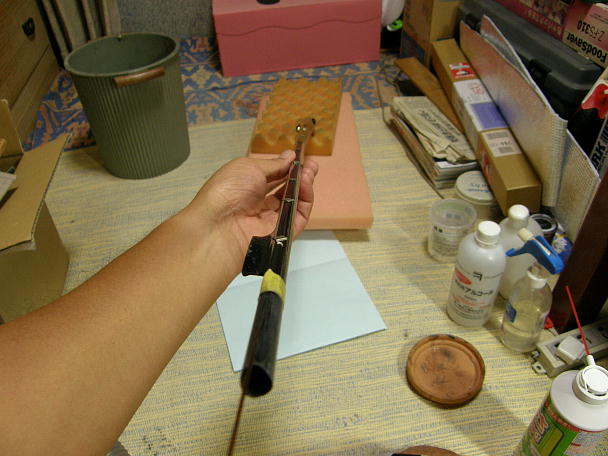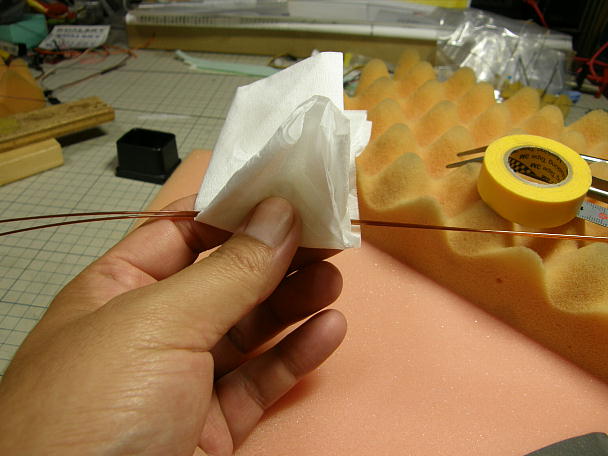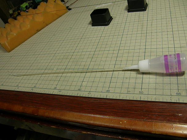 ![]() ポリイミドチューブを接着する準備をします。 チューブの接着を確実にするために、チューブを硬化促進剤を染み こませたティッシュで拭いておきます。 ![]() チューブをテールブーム内に接着するために長いノズルを瞬間接着剤に取り付けます。 ![]() チューブに綱線を通し、その綱線を磁石で吸い付けて位置決めをします。 ブームの後ろから瞬間接着剤を流し 込んで接着します。 |