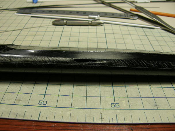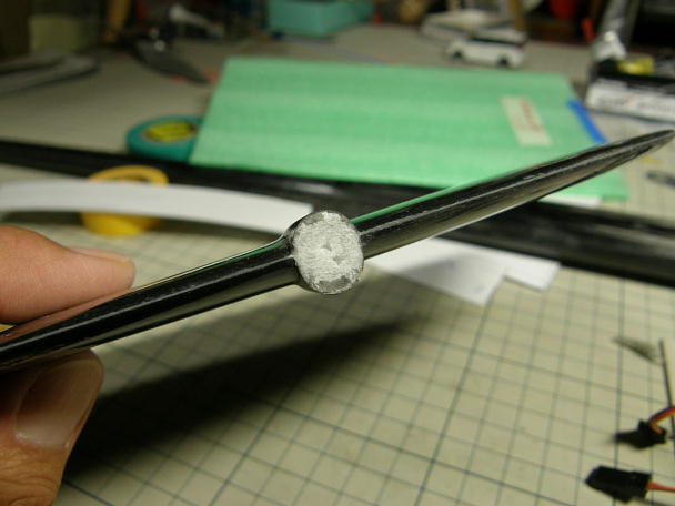 ![]() 垂直尾翼のポケットはロハセルのコアが詰まったままです。 ![]() 中のコアを掻き出してお掃除をします。 まず、リューターの荒削りビットでザックリとコアを削り取ります。 ポケットを傷つけないように注意します。 ![]() サンドペパーを丸めた物などを使って、綺麗にお掃除しました。 この辺りの工作が接着強度に関係してきます。 手を抜かず、きっちりと作業をしましょう。 ![]() スキッドを取り付ける溝を作ります。 切る場所をマーキングして、ピラニアソーで切れ込みをいれます。 BOOM の垂直尾翼は上下のデザインが酷似していますので向きを間違えないように注意します。 私は間違えて一度、上側に付けてしまいました。 ![]() カーボンシートをカーボンパウダー入り5分エポキシで接着します。 不要とも思われるスキッドですが、垂直尾翼 の痛みが減って、大変重宝しています。 |