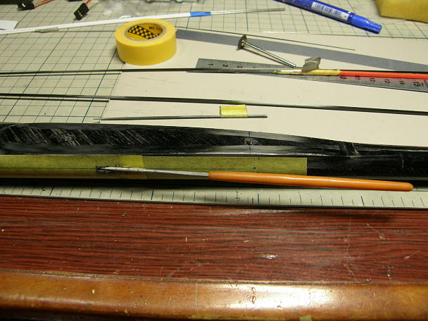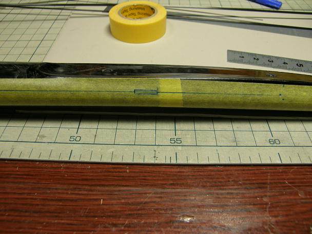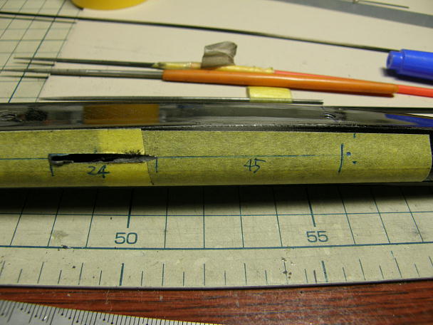 ![]() 胴体にエルロンリンケージのアウターが出る穴を加工します。 シミュレーションで把握はしていたのですが、思いの外 胴体の造形が複雑だったので現物合わせで確認をしました。 ![]() 穴を開ける位置をマーキングしました。 この穴が基準となって、ここから角度を合わせながら削っていきます。 ![]() アウターにするのは外径2ミリのカーボンパイプですので、2ミリの棒ヤスリを使って穴を加工します。 細かい造形は 1ミリ、0.8ミリの棒ヤスリを使います。 ![]() 加工が終わった所で計測すると、エルロンのヒンジラインから45ミリ、穴の全長は24ミリでした。 ![]() 加工が終わって養生を外した所です。 |