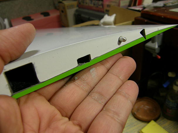 ![]() センターパネルで採取したテンプレートをコネクターホールに合わせてみました。 若干のズレはありますが、 この手の製品にしては高精度です。 ![]() エルロン側はコネクターがフリーに出入りするので、周囲を一ミリずつ広げています。 |