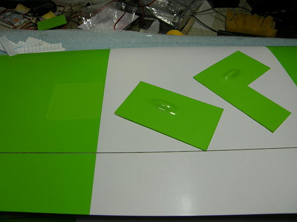 サーボカバーのカットラインをマスキングテープを使って出しています。 このラインに沿ってサーボカバーを ケガキ、カットしていきます。 ![]() キットには左右の分が一体になったFRP製の大きなシートが付属します。 今回もXplorer2と同様、サーボホーン は全て主翼内に収まりますので、脹らんだ部分は使用しません。 ![]() 脹らんだところを避けて、フラットな部分だけを使用してサーボカバーを切り出します。 ![]() 周囲をテープで貼って完了です。 |