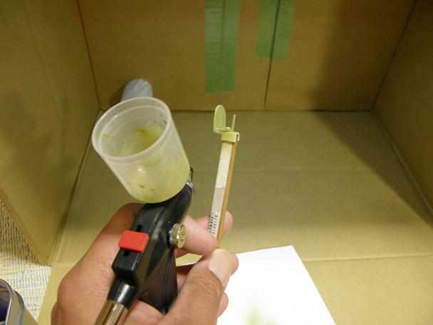 イスに操縦桿を接着するようになっていますが、接着する所がありません。 イスの一部を削り込んで、操縦桿の 入る部分を作ります。 操縦桿のバリ取りをしたら接着してしまいます。 ![]() この様になりました。 操縦桿は前席、後席の区別は無いのですが、太さも形状も全く違います。 スケール からすると太すぎる気もしますが、ここは気にせず行きます。 ![]() 機体内部の塗装をします。 機体内部色は各国、年代、機体メーカーで拘ると色々と種類がありますが、ここは クレオスの機体内部色で塗装します。 自作、簡易塗装ブースで、エアブラシを使って塗装します。 ![]() シートも同様に塗装します。 乾燥後に操縦桿の先端だけ、フラットブラックを筆塗りしています。 ![]() メーターパネルです。 メーターは三つしか再現されていません。 この手はメーターのシールとかが付属しそう なものですが、このキットには付属しませんので塗装で再現します。 ![]() 実機の資料を探してみると、メーターパネルは二タイプ存在していました。 黒塗りのメーターパネルと、木目調 の物です。 戦闘機として考えれば、視認性重視で黒塗りなんでしょうけど、民間機の塗装をしますので、木目調として塗装 をしていきます。 ![]() ベージュでパネルを筆塗りをして、乾燥したところでエナメル塗料のホワイトをモールド内流してメーターを表現 しました。 |