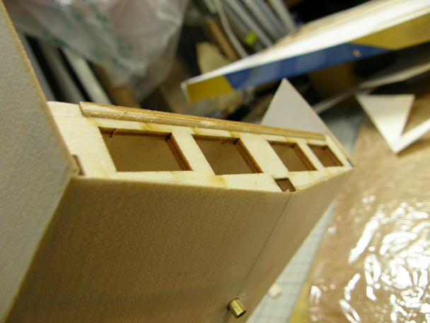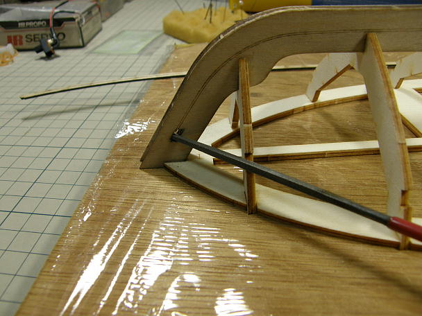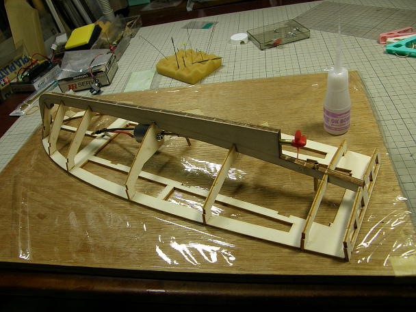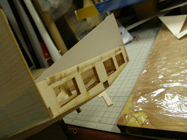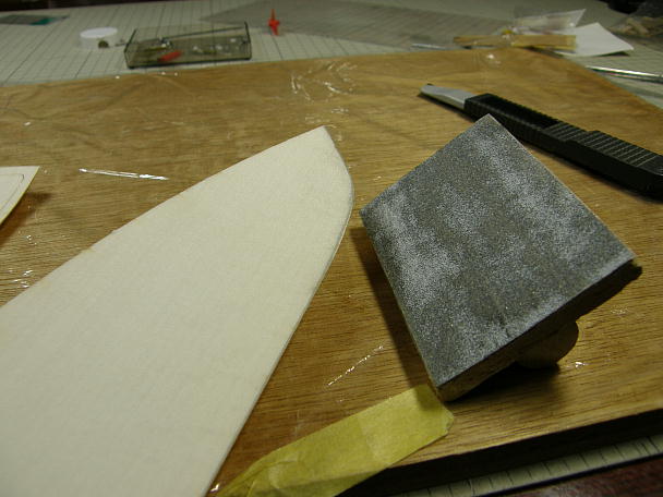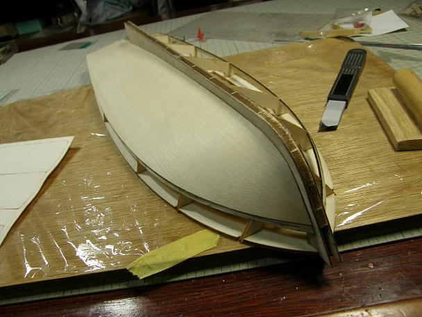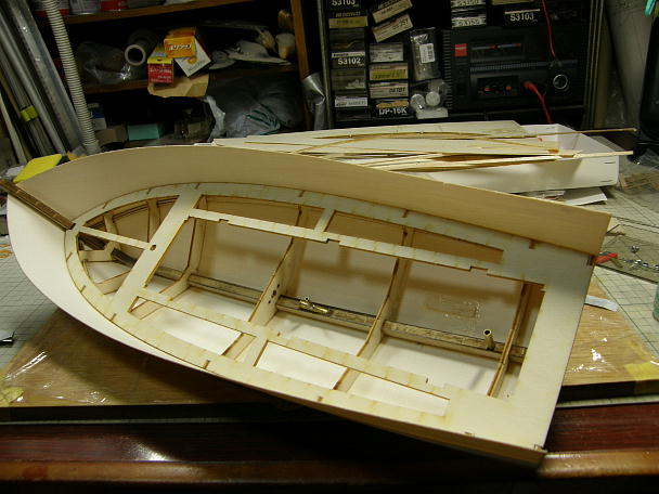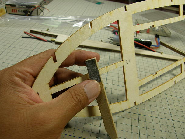 ![]() ナイロン繊維で補強された船底材は、ナイロン面を内側にして接着しますので、その部分を意識して、キールに 当たる面を斜めに削っておきます。 実際にフレームに当てながら、当たり具合を確認します。 ![]() ナイロン繊維で補強はされていますが、板厚は0.7ミリしかありませんので、予めの曲げ加工する事無く接着 出来ます。 ただし、無理矢理合わせても、フレームやキールにあってしまいますが、その場合、必ず何処かで板面が歪んで います。 ムリの無いように調整しながら接着します。 ![]() 底板と側面板の接着が終わりました。 側面板は底板の上に乗る感じになりますので、まだ削る工程は発生していません。 ![]() 後部のはみ出したフレームを削ってツライチにします。 外板材は後部外板接着のガイドになるのでそのままに しておきます。 ![]() フレームが削れました。 一応、取説の順番に作業を進めていますが、この工程はフレームのみの段階でやった 方が良いと思いました。 |