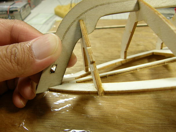 甲板下のフレームがこの船の基礎になります。 胴枠がスムーズにはまるようにほぞ溝を整形します。 スクラップ バルサにサンドペーパーを貼り、厚みを合わせた物で削ります。 ![]() モーターマウントのあるフレームは、スタンチューブと角度を合わせる必要があります。 3ミリの真鍮パイプの 内径が丁度2ミリなので、モーターシャフトとスクリューシャフトの軸線合わせに使い、フレームをキールに接着 します。 ![]() 甲板フレームを定盤に置いて、フレームをキールに接着していきます。 面で接着する部分以外は瞬間接着剤 を使用しています。 ![]() ヒノキのモール材が通るラインにあるフレームを、カーブに合わせて削ります。 ![]() ![]() キールとフレームの段差を取ります。 |