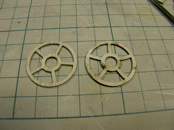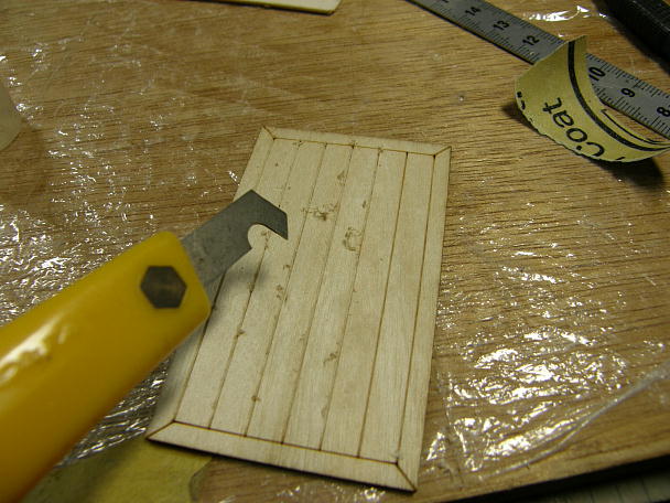 ![]() 甲板に貼るスノコ部分もレーザーカットのハーフカットから一段階彫り込んで、陰影を付けてあげます。 Pカッター で、味が出るように雑に掘ります。 ![]() ダミーの排気管ですが、船内の排気用に使えそうなので、下まで貫通させました。 |