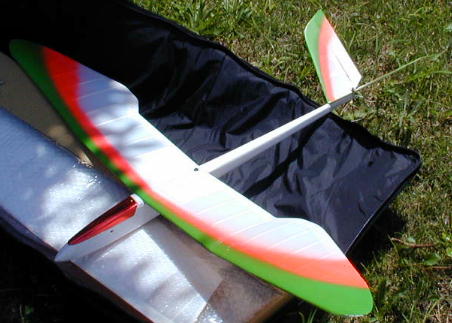 デモフライトを披露した坂下さんの電動ライトプレーンです。 ミニ四駆のモーターと120ミリのプロペラで良く飛びます。 水平尾翼が上に向いているのが解りますか?FF機特有の デサマライザーという機能です。タイマーを仕掛けて強制着陸 させます。 さもないとどこまででも飛んでいってしまいますから... |