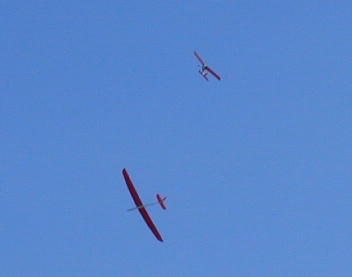 ホープ26(上の機体)がサーマル誘導をしているのは70インチクラスのグライダー 佐々木さんのLotusです。 島崎さんが「こっちにあるよー」と呼んでくれました。 |