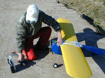 恒例なったタイムトライアル+定点着陸競技です。 今回は”ケイルグランプリ....だったかな”と命名されたこの競技、感を頼りに2分飛びきり 指定された20メートルの区間に着陸してその正確さを競います。 画像は島崎さんのトライアル、タイムを取るのはSIGさんです。 |