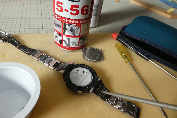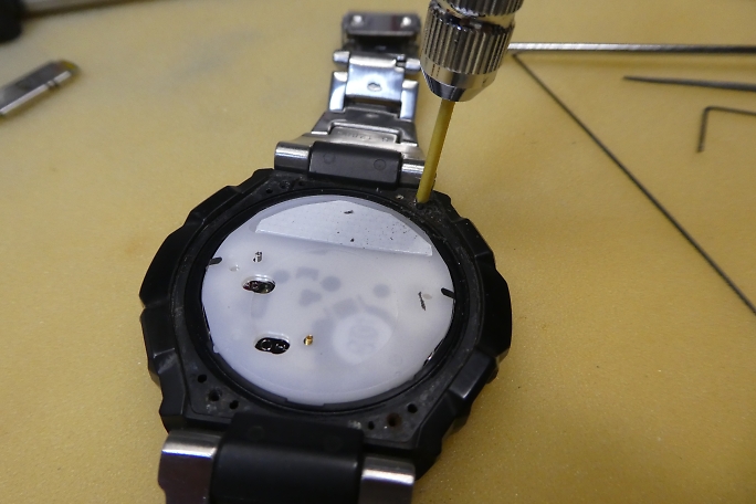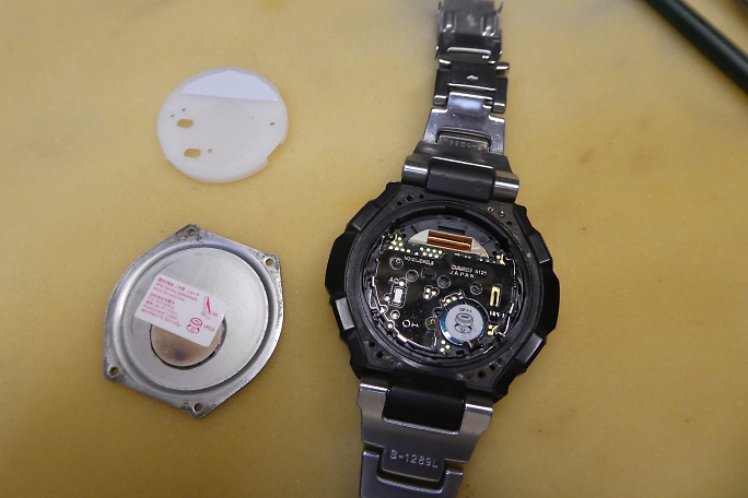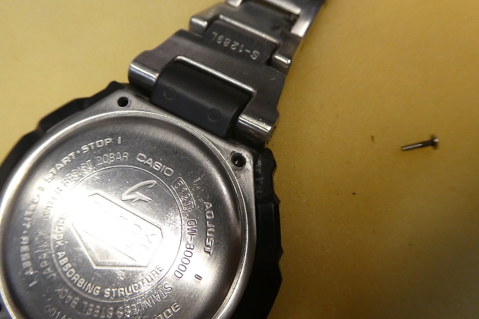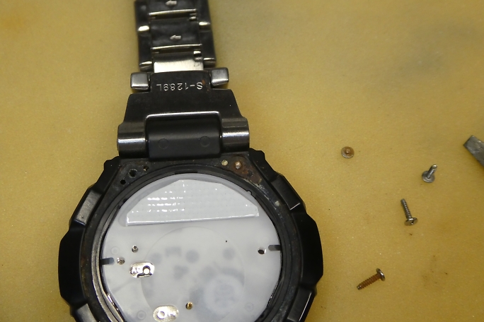 ![]() G−SHOCKなどのCASIOの腕時計の裏蓋は4本のネジで固定されています。 ベゼルは樹脂なので、それほど固く締まってはいないと踏んでいましたが、一本のネジが頭からねじ切れてしまいました。 折れたネジの下のネジは真っ赤っかに錆びていました。 ステンレスでは無く、ニッケルメッキのネジだったようです。 汗の染みた影響でしょうか。 ![]() とりあえず作業は続行です。 両側の薄い金属の爪を起こして樹脂のカバーを外します。 蓋と基板を接触させる為に二本の極小スプリングが飛び出していますので、紛失には注意します。 ![]() 蓋の裏には使用するバッテリーの型番と電池交換後のリセット方法が書かれたシールが貼られていました。 |
