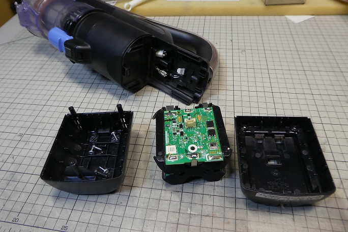バッテリーは掃除機後端のネジ一本で分離することができます。 平端子の+と−を取り外し、3線のコネクタを 外せばバッテリーを取り外せます。 上下分割のケースを外すと、保護回路とバッテリーが出て来ます。 ![]() 本体側のコネクタはこのようになっています。 バッチングコードでマキタバッテリーを繋いで確認した所、正常に動作 したので、平端子だけ接続すれば問題無さそうです。 3線のコネクタは多分充電用でしょう。 |