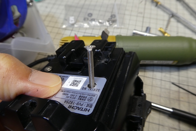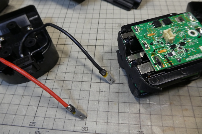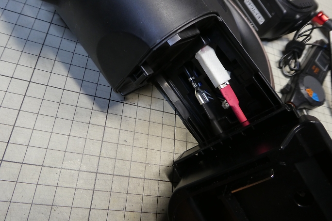 ![]() 毎度お馴染み、マキタバッテリーアダプターのコードに平端子をバッテリーパックから取り外して移植します。 ![]() シュリンクチューブで保護します。 ![]() バッテリーパックの上蓋部分、本体との接続レールのある方に、マキタバッテリーアダプターを噛み込ませる為の 溝を加工します。 ![]() 上蓋とマキタバッテリーアダプターはこの様に噛み合わさります。 |